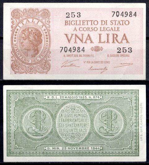 Италия 1 лира 1944 Pick 29 a бумага UNC (пресс) 8621-12-2-1