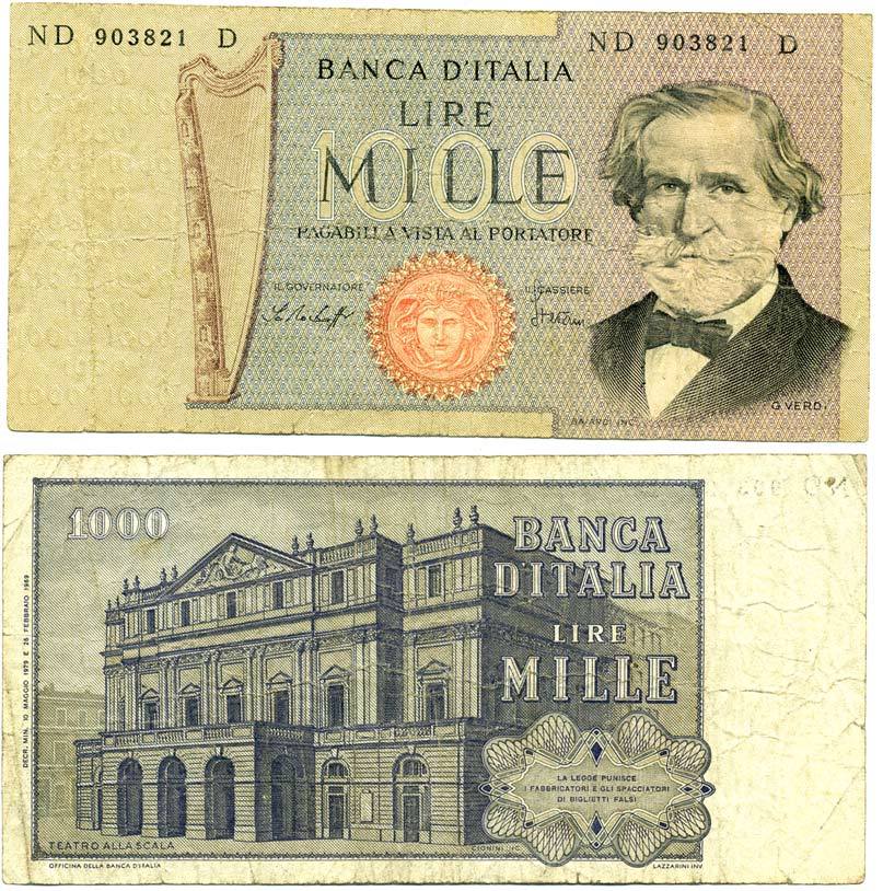 Италия 1000 лир 1979 Джузеппе Верди, Милан Ла Скала Pick 101f бумага 7553-15-1