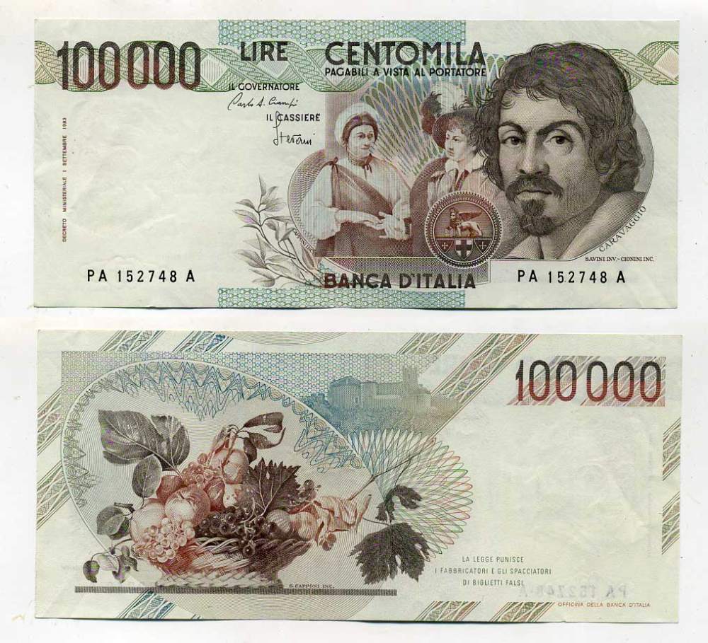 Италия 100000 лир 1983 Караваджо, фруктовый букет, подпись Stevani Pick 110а бумага 450-71-2