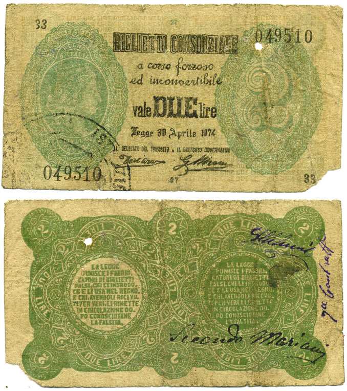 Италия 2 лиры 1874 номер 049510 Pick 3 бумага 8611-27-3-1