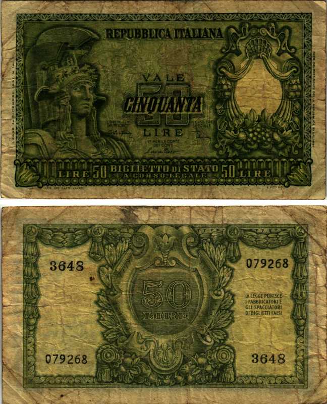 Италия 50 лир 1951 Афина Pick 91b бумага 7548-120-3-1