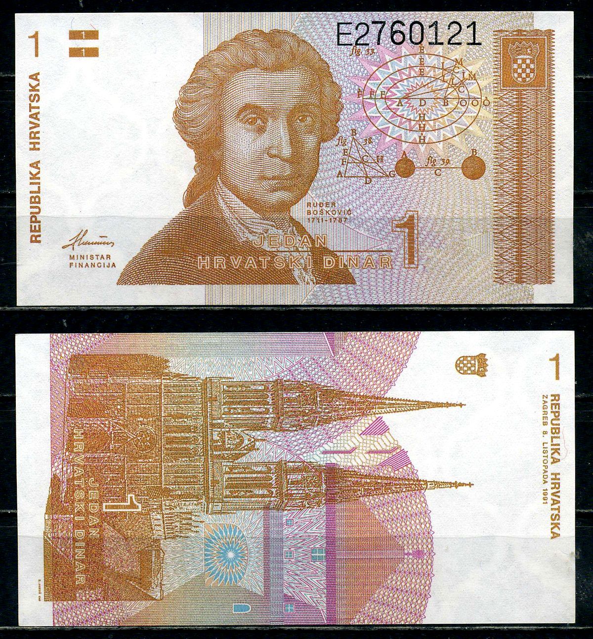 Хорватия 1 динар 1991 Руджер Иосип Бошкович, кафедральный собор Загреба Pick 16 бумага UNC (пресс) 2119-25-2-2