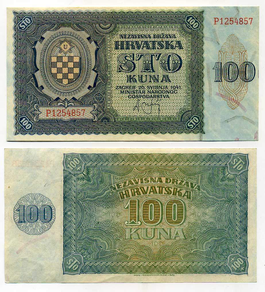 Хорватия 100 куна 1941 26 мая 1941, Немецкая оккупация Pick 2 бумага аUNC 451-721-1