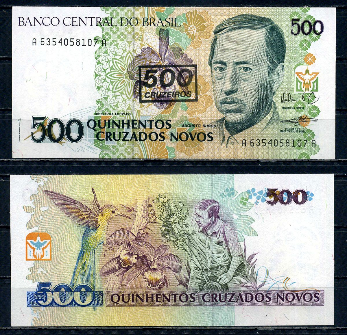 Бразилия 500 крузейро ND (1990) надпечатка на 500 крузадо новых, серия А 6354, Аугусто Руши - Бразильский биолог Pick 226 b бумага UNC (пресс) 6317-18-3-2