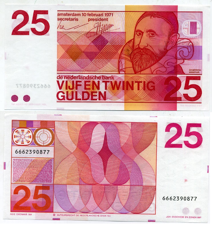 Нидерланды 25 гульденов 1971 Ян Питерсзон Свелинк (1562-1621), серийный номер 10 цифр Pick 92a бумага 451-12-1