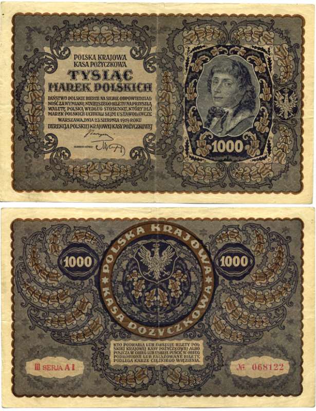 ПОЛЬША 1000 МАРОК 1919 23 АВГУСТА 1919, ТРЕТИЙ ВЫПУСК, ТАДЕУШ КОСТЮШКО, III SERIA AI Pick 29 бумага 6262-6-1-1