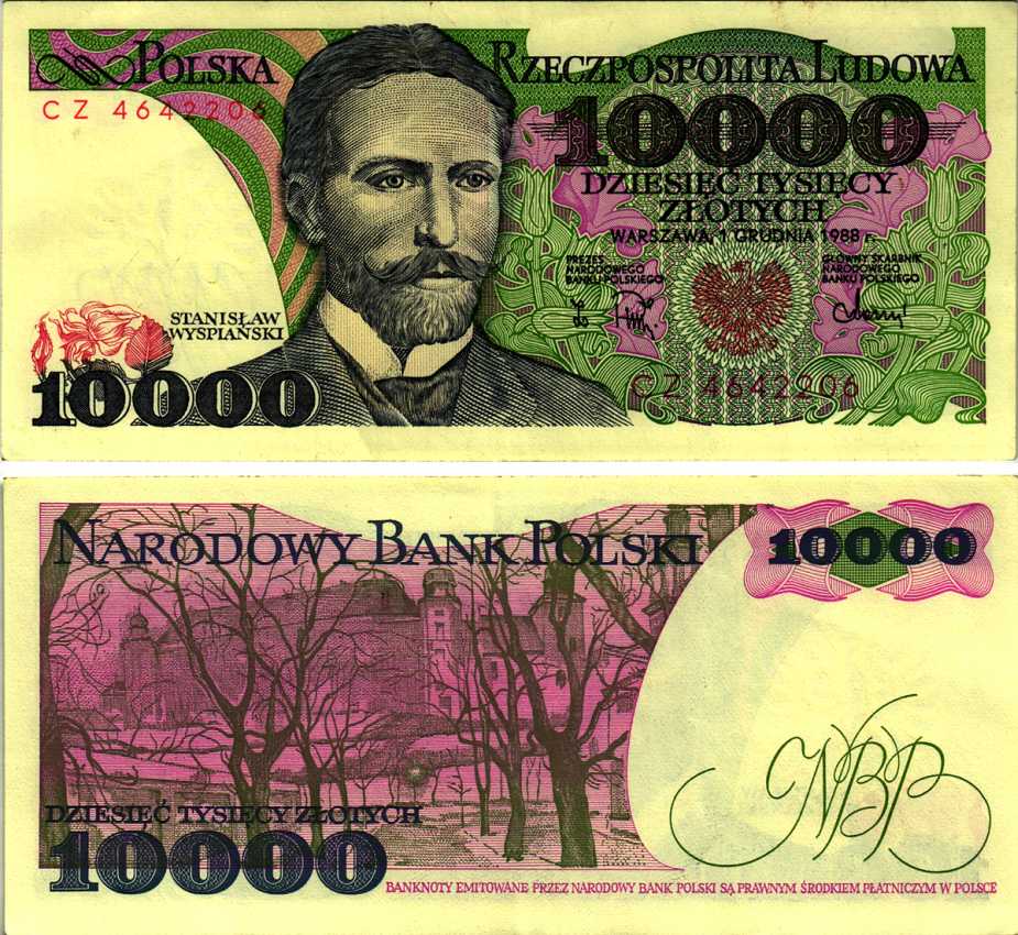 ПОЛЬША 10000 ЗЛОТЫХ 1988 1 ДЕКАБРЯ 1988, СТАНИСЛАВ ВЫСПЯНЬСКИЙ Pick 151b бумага аUNC 6352-29-1-2