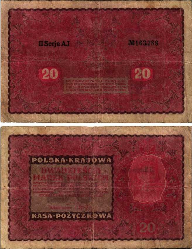 Польша 20 марок 1919 Pick 26 (1) Национальная касса, 23 августа 1919, II серия, королева Ядвига, серия AJ Pick 26 бумага 7183-37-1-1