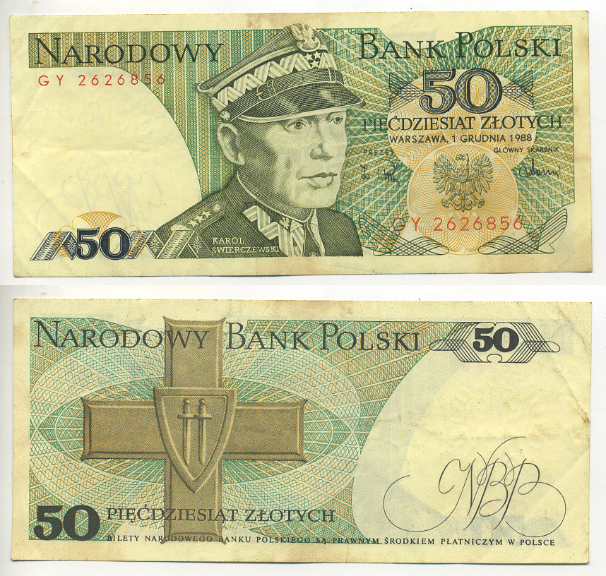 ПОЛЬША 50 ЗЛОТЫХ 1988 1 ДЕКАБРЯ 1988, КАРОЛЬ СВЕРЧЕВСКИЙ Pick 142c бумага 7553-17-2