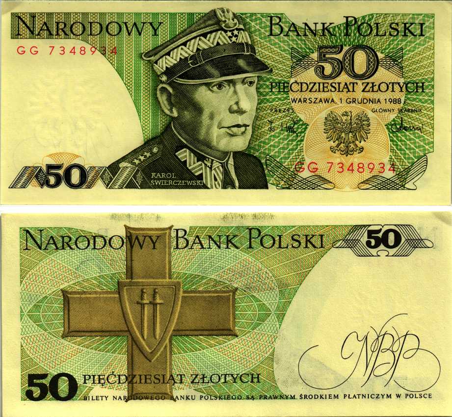 ПОЛЬША 50 ЗЛОТЫХ 1988 1 ДЕКАБРЯ 1988, КАРОЛЬ СВЕРЧЕВСКИЙ Pick 142с бумага аUNC 8607-73-2-2