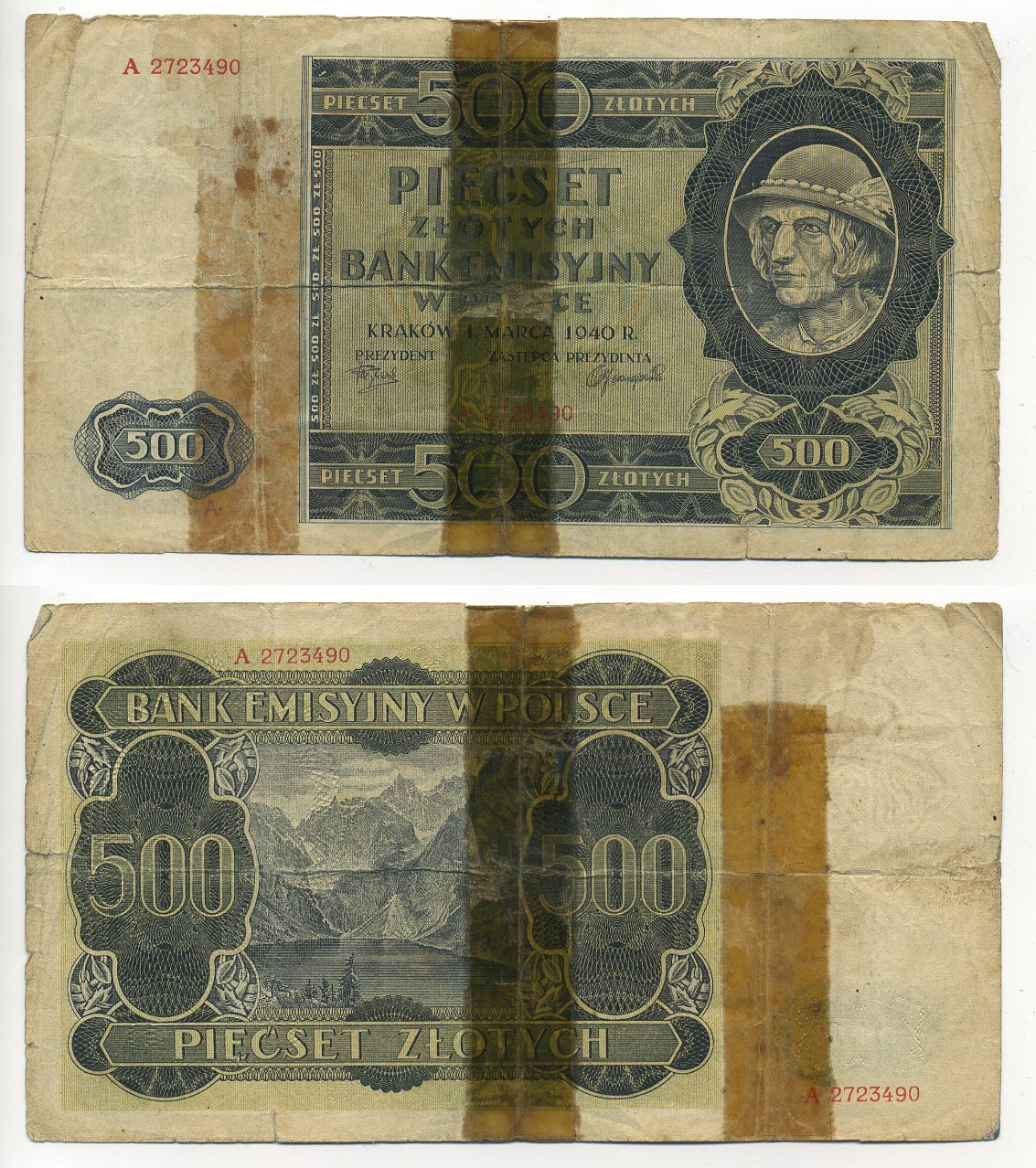 Польша 500 злотых 1940 гурал, озеро Морское Око, серия B Pick 98 a, Розенберг 578 бумага 6352-30-2-2