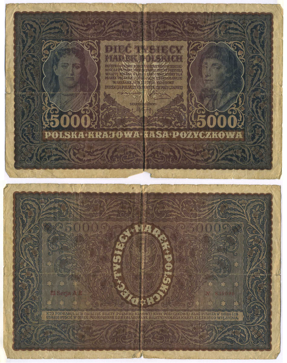 ПОЛЬША 5000 МАРОК 1920 7 ФЕВРАЛЯ 1920, КОСТЮШКО Pick 31 бумага 8595-22-2