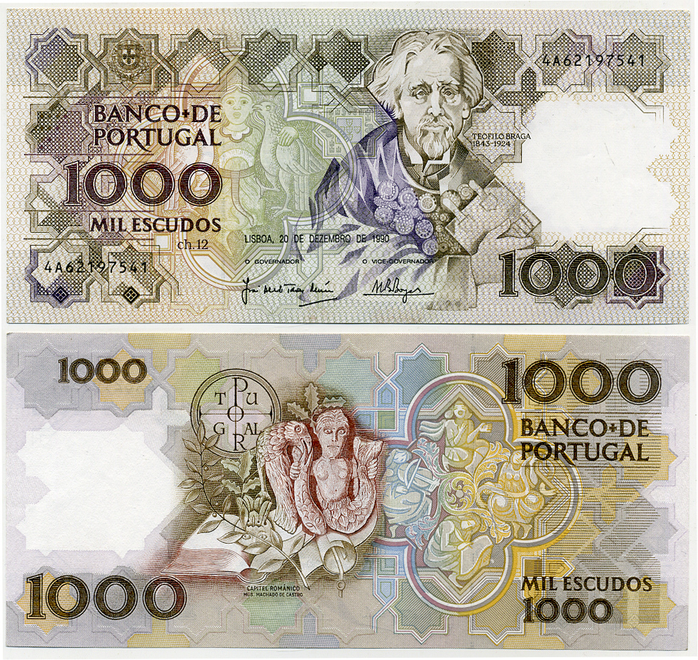 ПОРТУГАЛИЯ 1000 ЭСКУДО 1990 20.12.1990, Теофилу Брага, подписи 1-2 Pick 181h бумага aUNC 8564-9-3