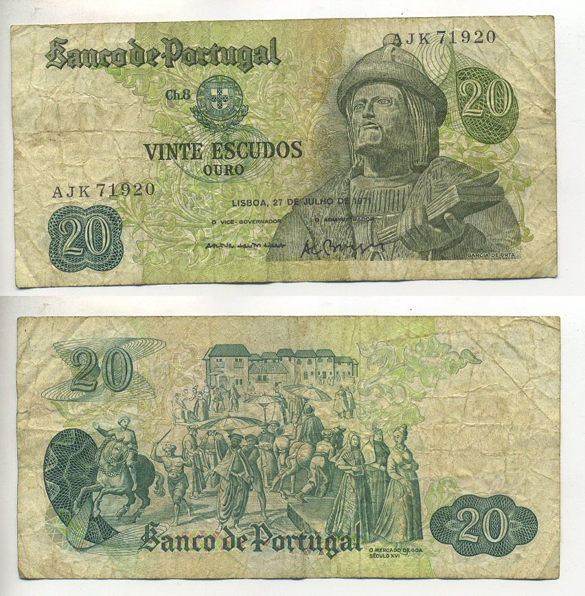 ПОРТУГАЛИЯ 20 ЭСКУДО 1971 27 ИЮЛЯ 1971, ГАРСИЯ ДЕ ОРТА, 16 ВЕК РЫНОК НА ГОА Pick 173 бумага 7552-33-3