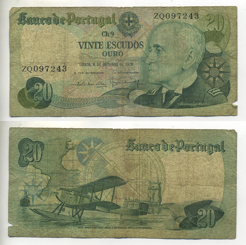ПОРТУГАЛИЯ 20 ЭСКУДО 1978 4 ОКТЯБРЯ 1978, АДМИРАЛ ГЭГО КУТИНЬО, САМОЛЕТ, АЭРОПЛАН Pick 176b бумага 7552-38-3