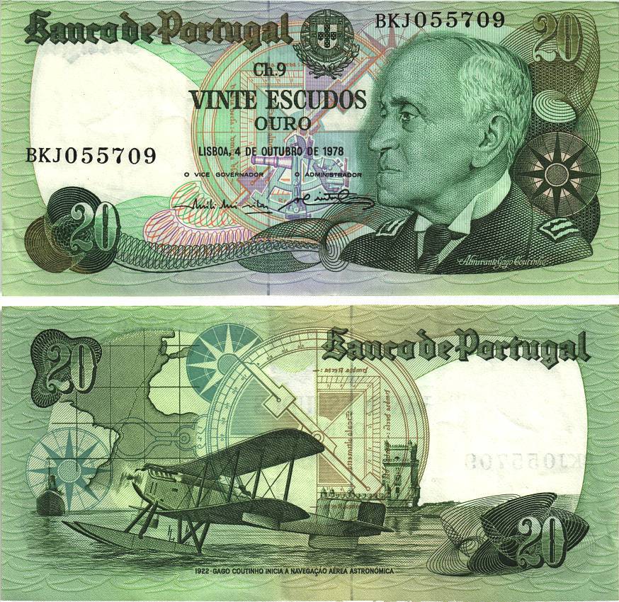 ПОРТУГАЛИЯ 20 ЭСКУДО 1978 АДМИРАЛ ГАГУ КУТИНЬЮ, ГИДРО САМОЛЕТ, 4 ОКТЯБРЯ 1978 Pick 176b бумага aUNC 8606-28-1-2