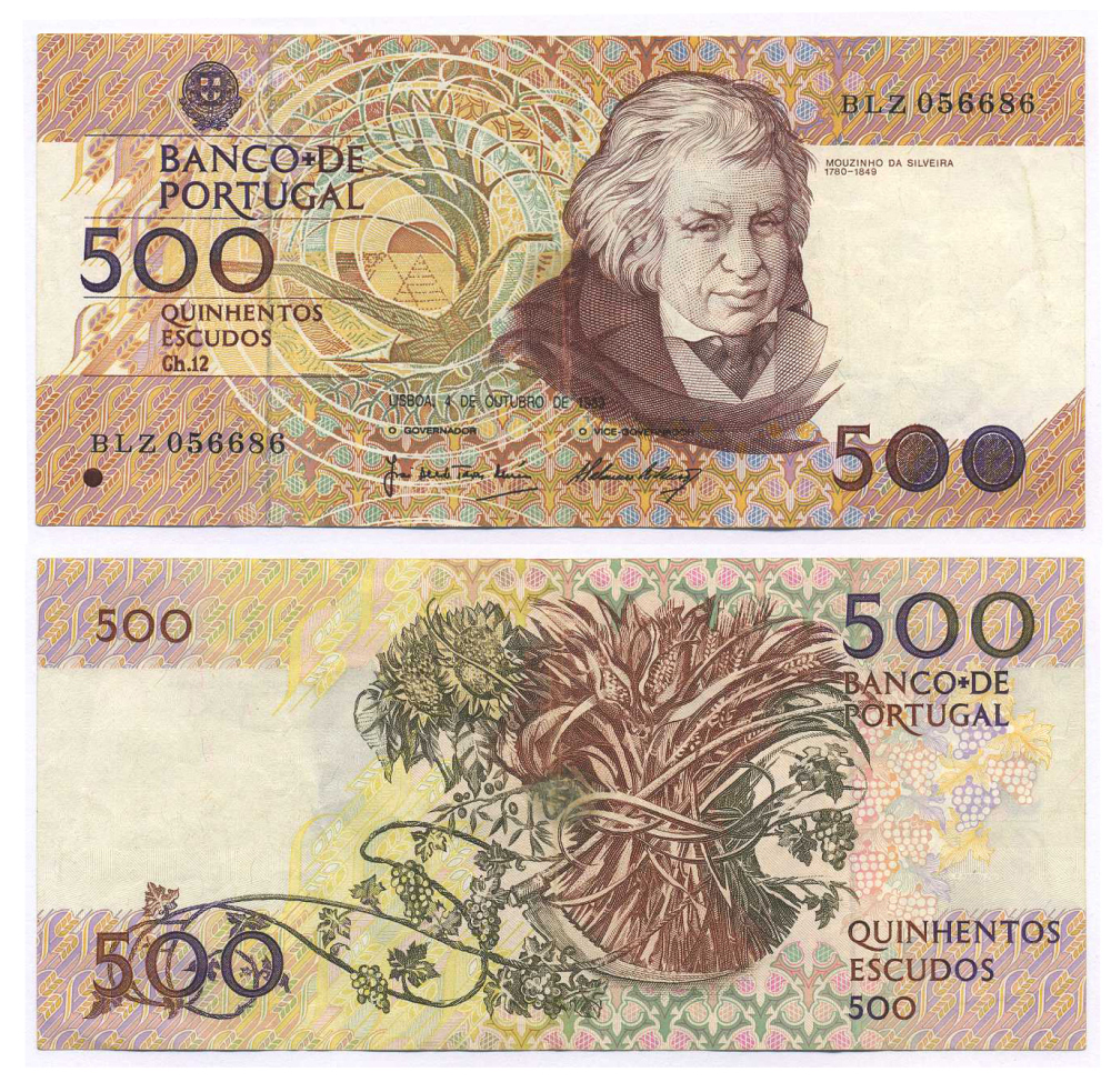ПОРТУГАЛИЯ 500 ЭСКУДО 1989 4 ОКТЯБРЯ 1989, ЖОЗЕ КСАВЬЕ МУЗЕНХО ДА СИЛЬВЕЙРА Pick 180с бумага 8595-20-3-2