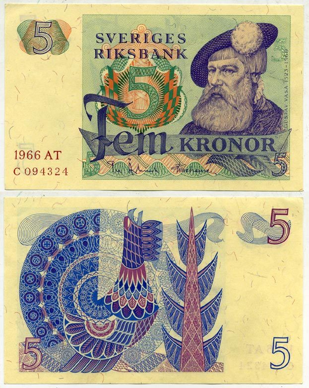 Швеция 5 крон 1966 AT, Густав I Ваза Pick 51a бумага aUNC 2192-13-2