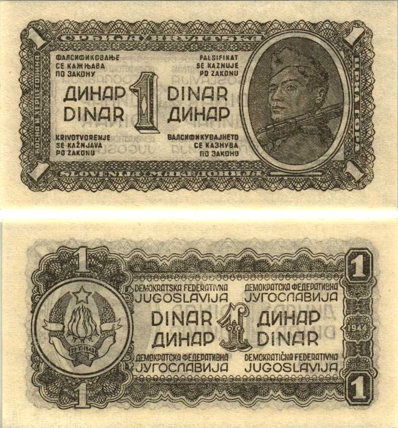 ЮГОСЛАВИЯ 1 ДИНАР 1944 ТОНКАЯ БУМАГА, БЕЗ ЗАЩИТНОЙ ПОЛОСЫ, ДЕМОКРАТИЧЕСКАЯ ФЕДЕРАТИВНАЯ ЮГОСЛАВИЯ Pick 48b бумага UNC (ПРЕСС) 7547-16-1-1