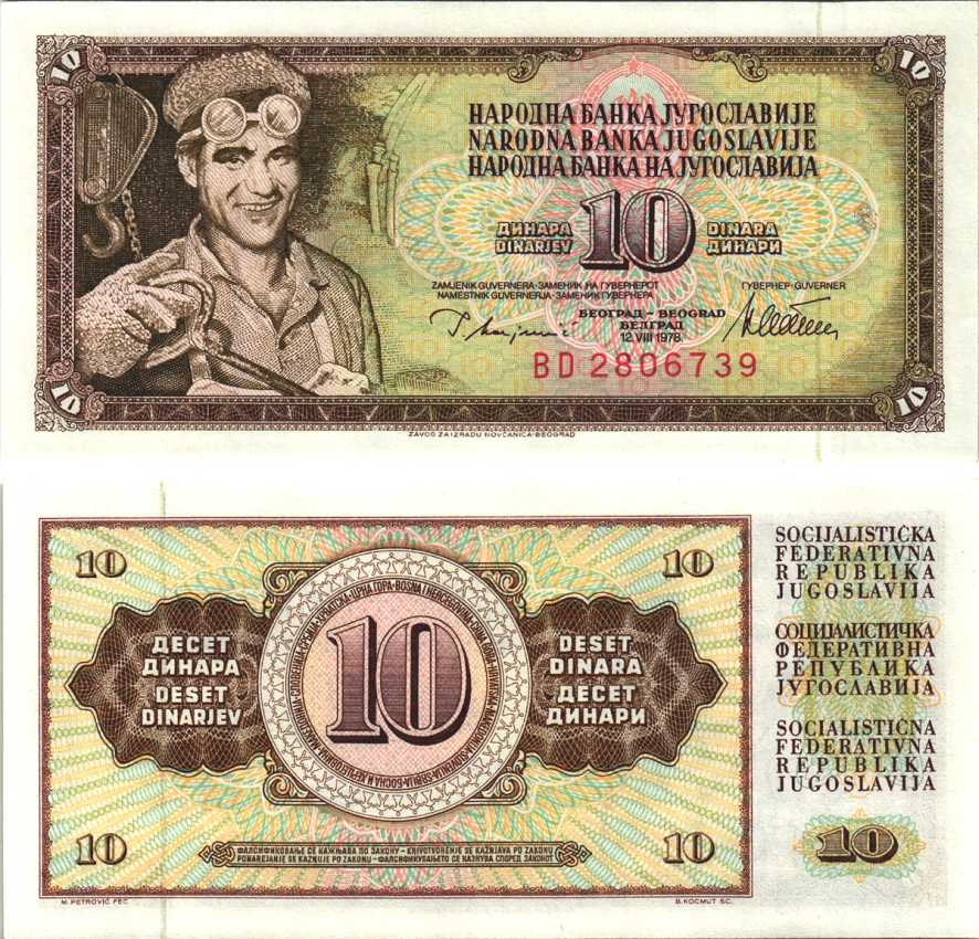 ЮГОСЛАВИЯ 10 ДИНАРОВ 1978 12 АВГУСТА 1978, СЕРИЯ BD, ПОДПИСЬ 10, С ЗАЩИТНОЙ ПОЛОСОЙ Pick 87а бумага аUNC 6312-9-3-1