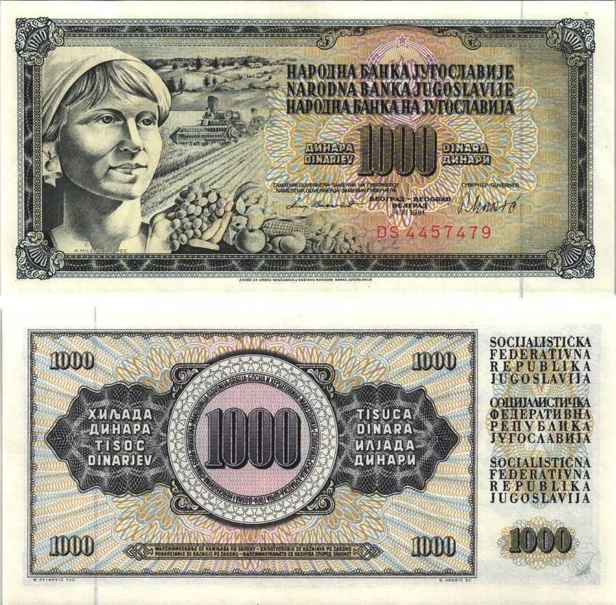Югославия 1000 динаров 1981 крестьянка с фруктами Pick 92 d бумага аUNC 6312-28-2-2
