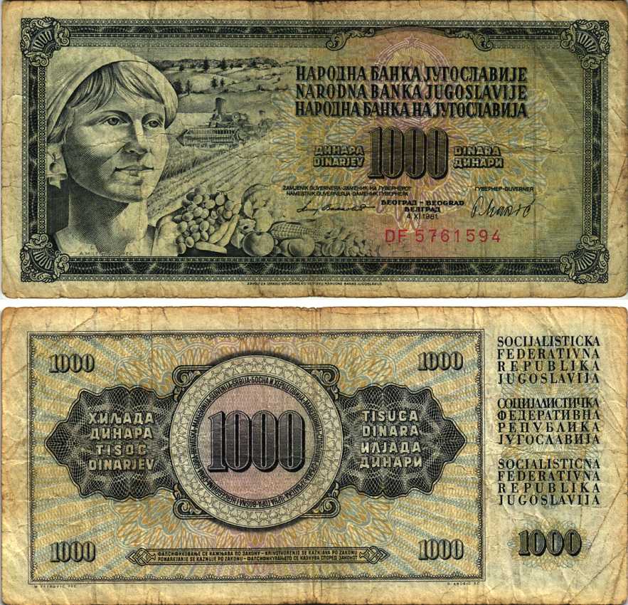 ЮГОСЛАВИЯ 1000 ДИНАРОВ 1981 4 НОЯБРЯ 1981, ПОДПИСЬ 11, ЖЕНЩИНА С ФРУКТАМИ Pick 92d бумага 7148-13-2-1