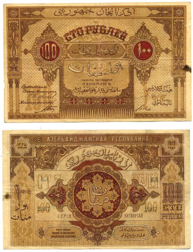АЗЕРБАЙДЖАНСКАЯ ДЕМОКРАТИЧЕСКАЯ РЕСПУБЛИКА 100 РУБЛЕЙ 1919 СЕРИЯ ЧЕТВЁРТАЯ, ЕЛ №2367, АЗЕРБАЙДЖАНСКАЯ РЕСПУБЛИКА Pick 5, Кардаков К8.6.4 бумага 439-54-2-1