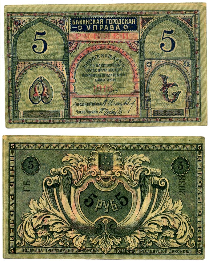 Бакинская Городская Управа 5 рублей 1918 Pick S723, Кардаков 8.10.11 бумага 00-00