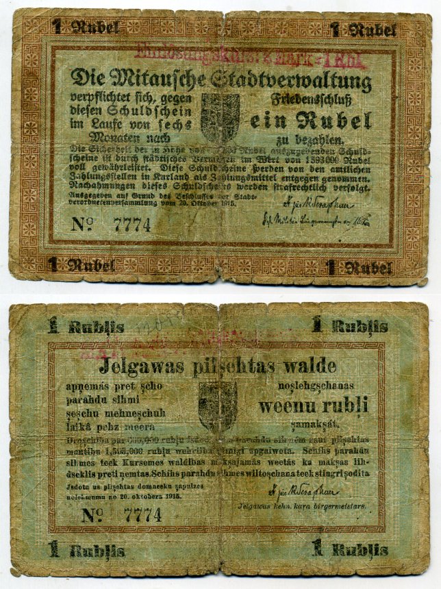 Митава. Городское Общественное правление 1 рубль 1915 Долговая расписка. Schuldenschein. 20.10.1915 Кардаков 4.7.26 a бумага 451-83-1