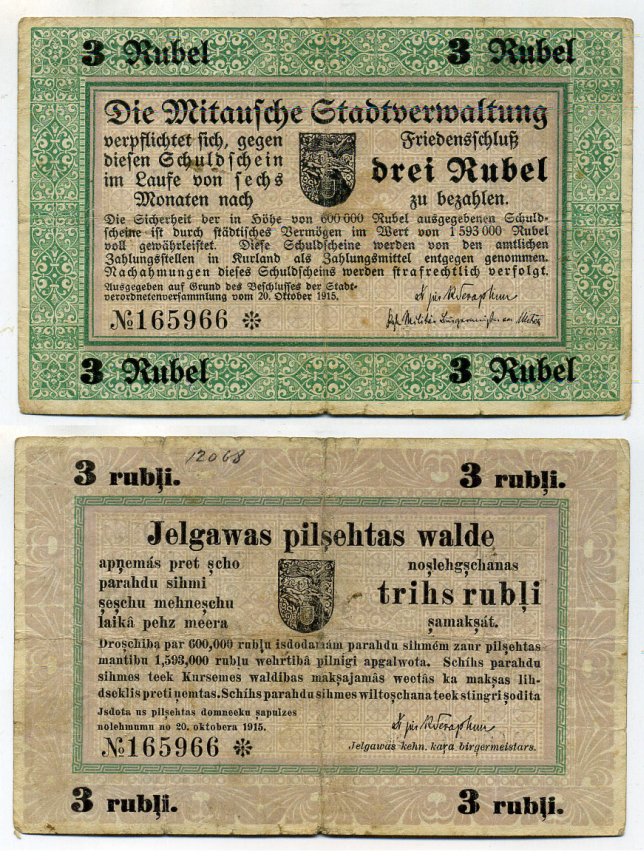 Митава. Городское Общественное правление 3 рубля 1915 Долговая расписка. Schuldenschein. 20.10.1915 Кардаков 4.7.27 b бумага 000-00-00