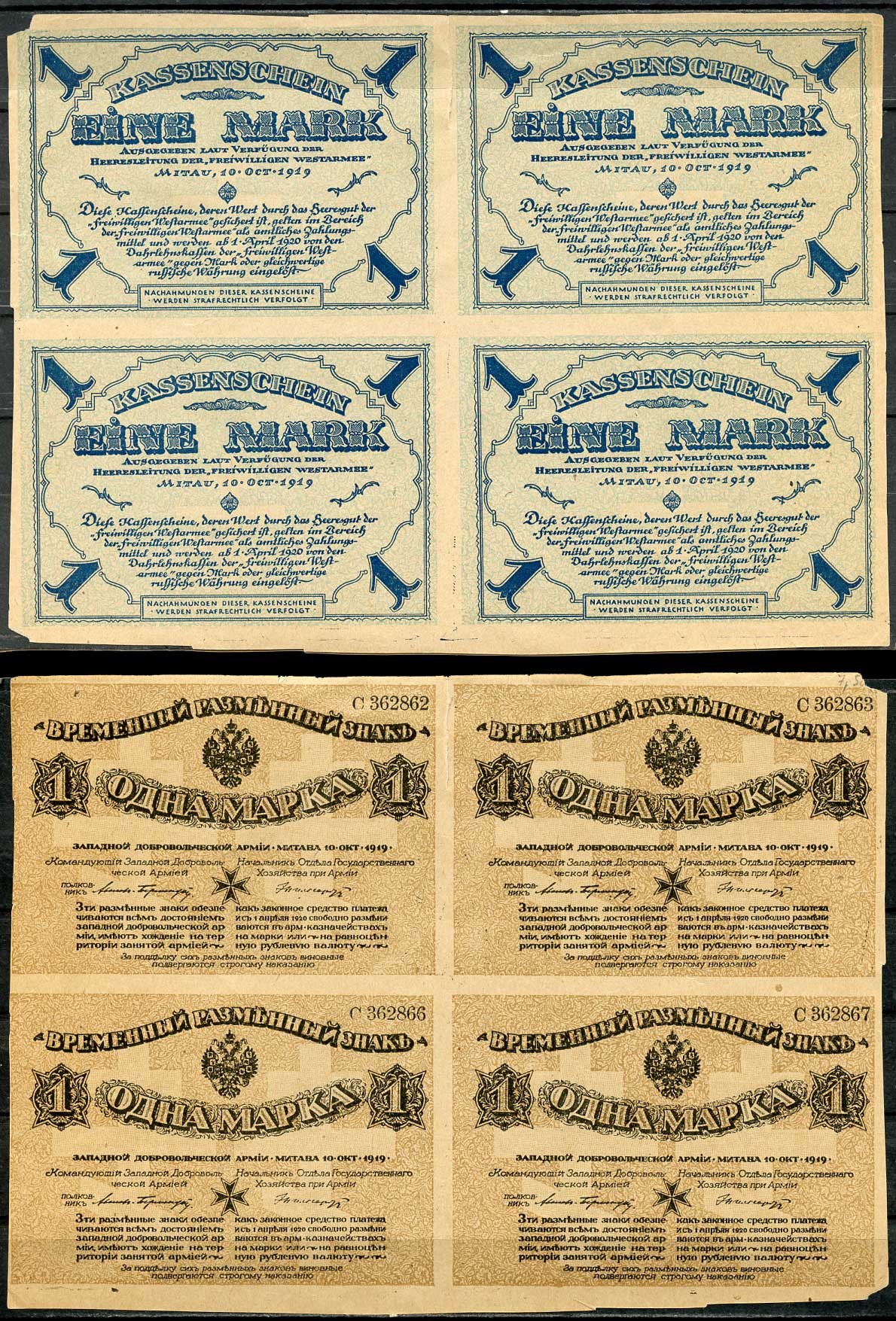 Западная Добровольческая Армия (полковник П.Р.Бермондт, Князь Авалов) 1 марка, квартблок из 4 штук 1919 Временный разменный знак, серия С, без конгрева Кардаков 4.1.5 бумага 437-81-1-2