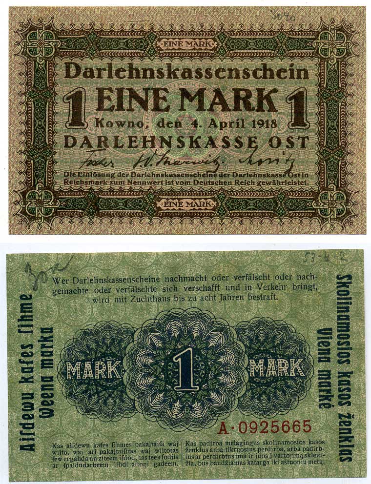 КАУНАС (KOWNO) 1 МАРКА 1918 4 АПРЕЛЯ 1918, ГЕРМАНСКАЯ ОККУПАЦИЯ, ПЕРВАЯ МИРОВАЯ, OST, СЕРИЯ A Розенберг 465, Рябченко 14611 бумага 444-44-1-1