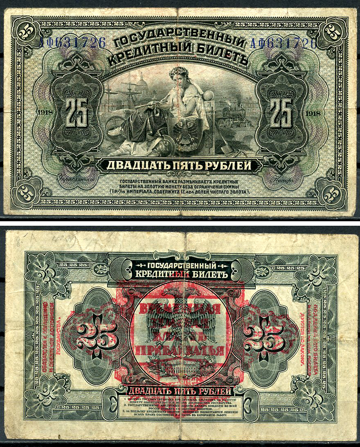 Дальне-Восточная Республика (ДВР) 25 рублей 1918 Временная Земская Власть Прибайкалья. Государственный кредитный билет 25 рублей 1918 (1920) Pick S1196, Кардаков 11.12.1 бумага 439-20-3-2
