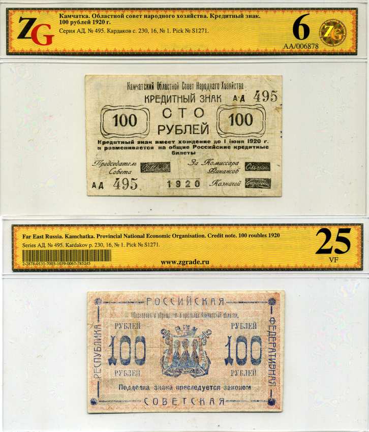 Камчатка 100 рублей 1920 Кредитный знак. Камчатский Областной Совет Народного Хозяйства, в холдере компании ZG. Сохранность - 6 Кардаков, с. 230, раздел 16, № 1, Pick S1271 бумага 000-00-00