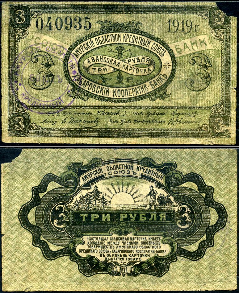 Хабаровск 3 рубля 1919 авансовая карточка. Амурский Областной Кредитный Союз. Хабаровский Кооператив-Банк Кардаков K11.31.86 бумага 504-37-3-2