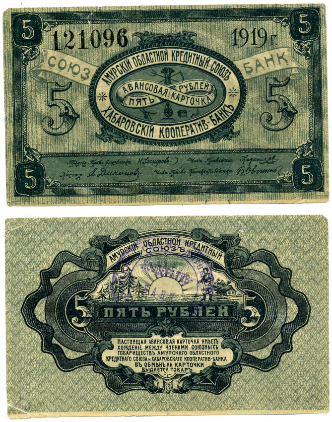 Хабаровск 5 рублей 1919 Авансовая карточка. Амурский Областной Кредитный Союз. Хабаровский Кооператив-Банк Kардаков 11.31.91 бумага 000-00-00