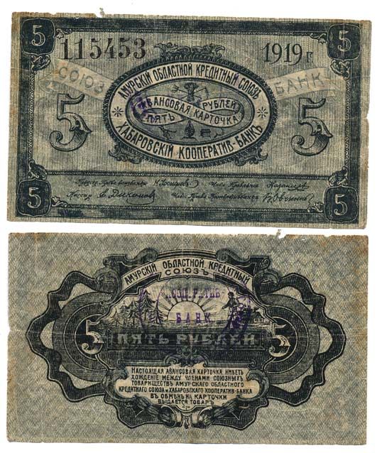 ХАБАРОВСК 5 РУБЛЕЙ 1919 Авансовая карточка. Амурский Областной Кредитный Союз. Хабаровский Кооператив-Банк Kардаков 11.31.91 бумага 451-378-1