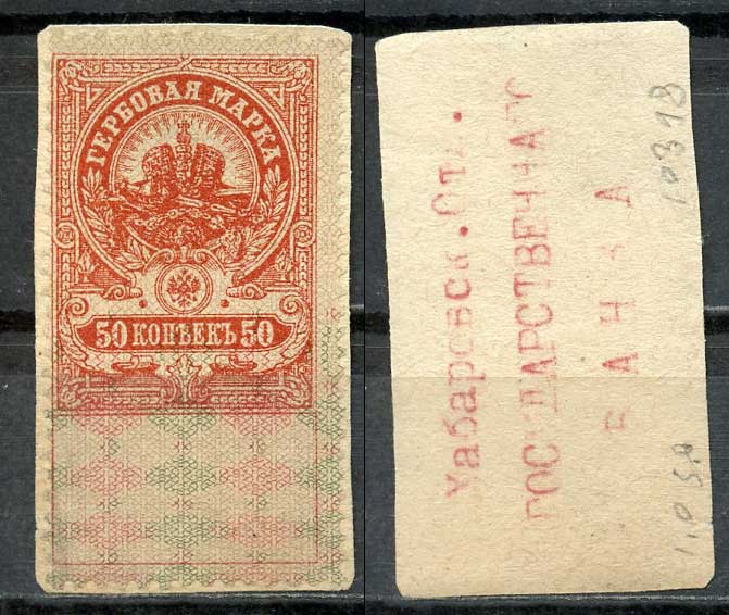 Хабаровск 50 копеек ND (1918) Хабаровское Отделение Государственного Банка. Гербовая марка Кардаков11.31.14 бумага 000-00-00