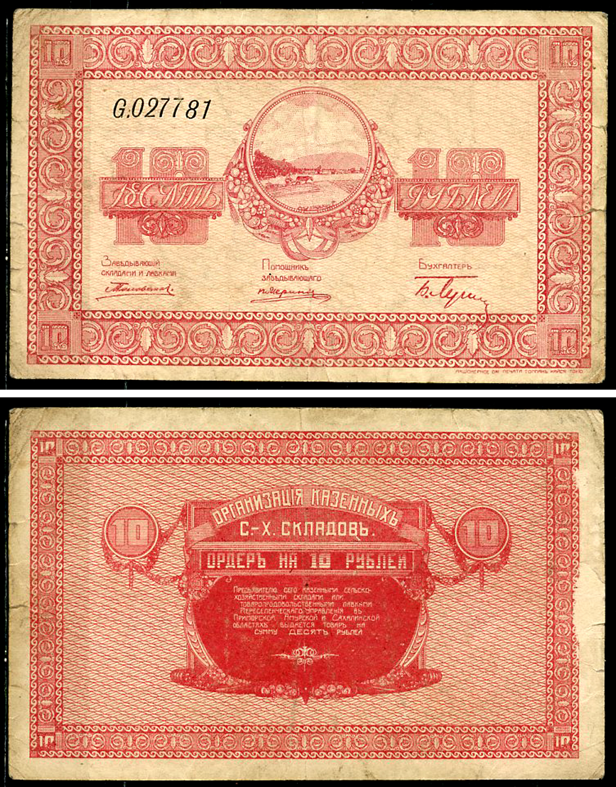 Никольск-Уссурийск. Приморская область 10 рублей ND (1919) Переселенческое управление. Организация Сельско-Хозяйственных складов. Ордер. Кардаков, с. 243, раздел 40, № 4, Pick S1234 бумага 437-47-1-2