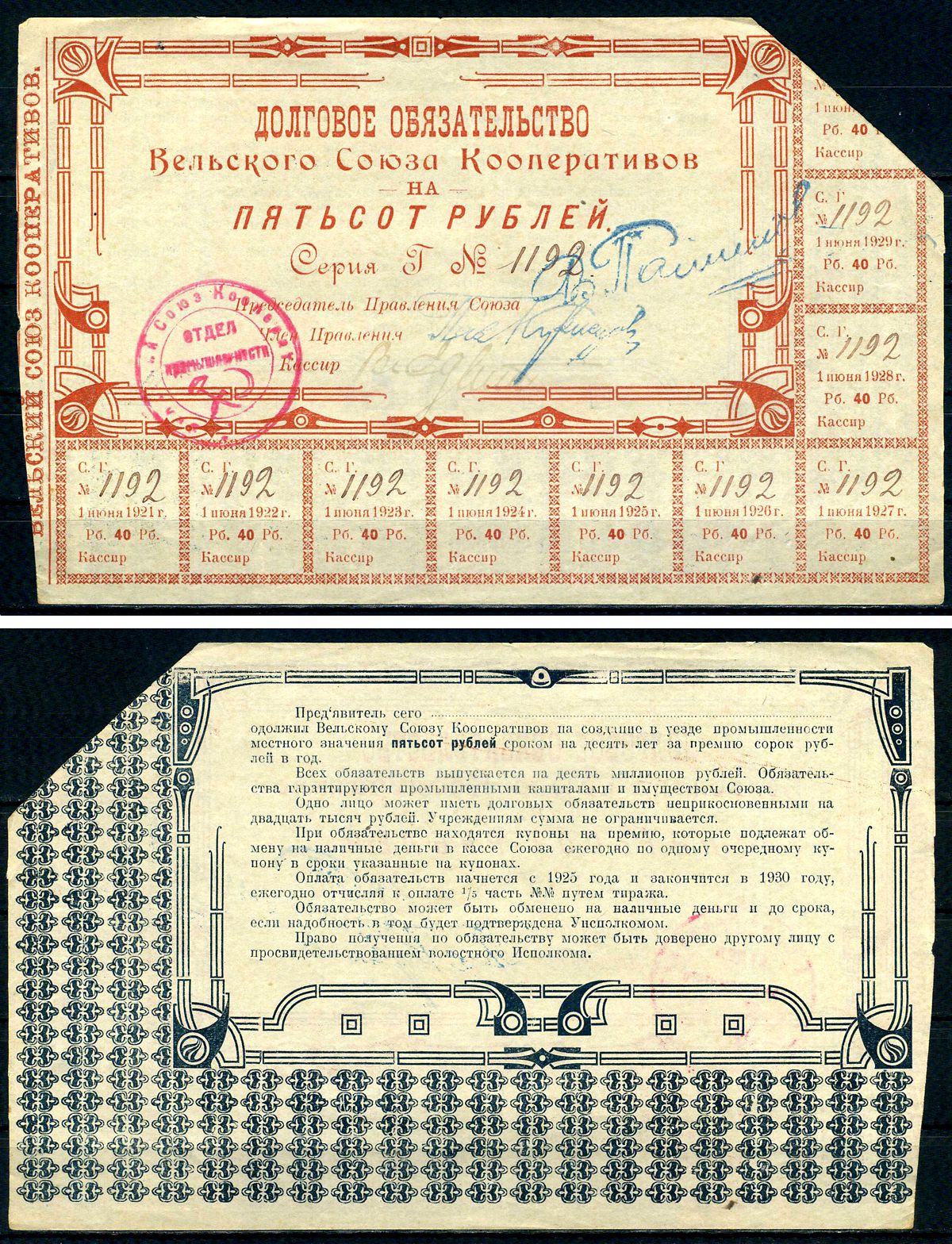 Вельск 500 рублей 1920 Вельский Союз кооперативов, долговое обязательство Рябченко 6687 бумага aUNC 451-499-1