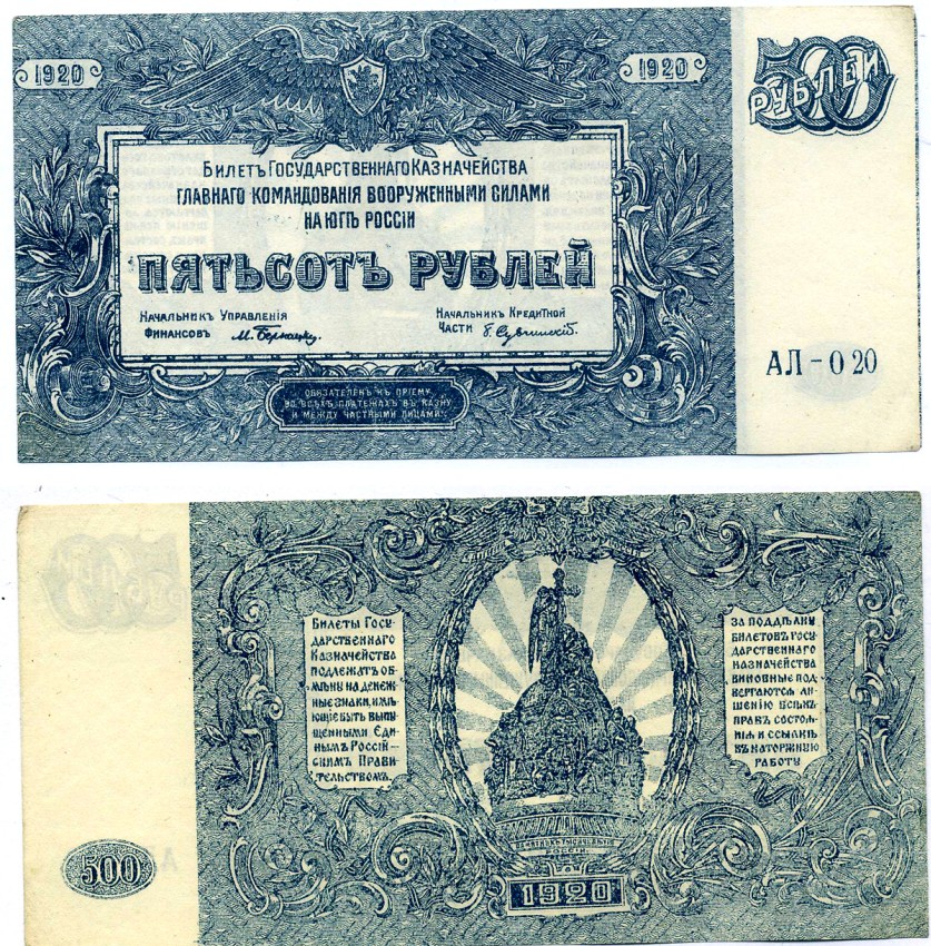 Главное Командование Вооруженными Силами на Юге России 500 рублей 1920 билет Государственного Казначейства, серия АЛ Pick S434, Кардаков 6.3.26 бумага aUNC 439-59-1-1