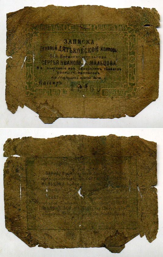 Дядьково. Главная Дятьковская контора С.И.Мальцева 25 копеек сереброМ ND Записка его превосходительства С.И. Мальцева. 4 выпуск. Водяной знак 25 копеек Рябченко 1743 р (вариант) бумага 451-27-1