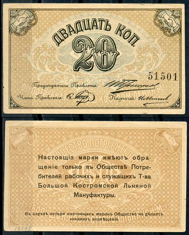 Кострома 20 копеек ND (1918) Общество потребителей рабочих и служащих т-ва большой Костромской льняной мануфактуры. Марка Рябченко 8407 р бумага aUNC 438-53-2-2