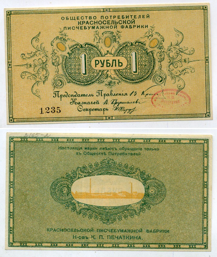 Красное Село (Пушкин) 1 рубль ND Общество потребителей Красносельской писчебумажной фабрики. марка Рябченко № 7516 р бумага 451-483-1