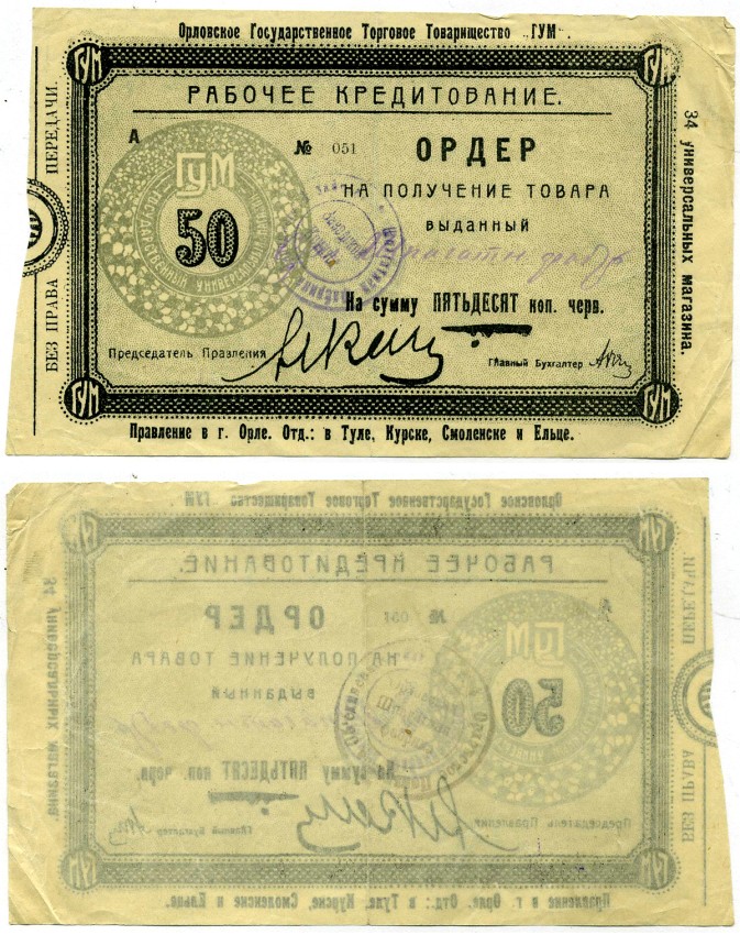ОРЛОВСКОЕ ГОСУДАРСТВЕННОЕ ТОРГОВОЕ ТОВАРИЩЕСТВО ГУМ ОРДЕР НА ПОЛУЧЕНИЕ ТОВАРА НА 50 копеек ОТ ЧЕРвонНОГО рубля ВЫДАН ЗАВОДСКИМ КОМИТЕТОМ ШПАГАТНОЙ ФАБРИКИ, бумага белая ТОНКАЯ, 2,5 мм., ПОСЛЕ ЧЕРВ ОДНА ТОЧКА Рябченко 9055р бумага 437-13-1-1