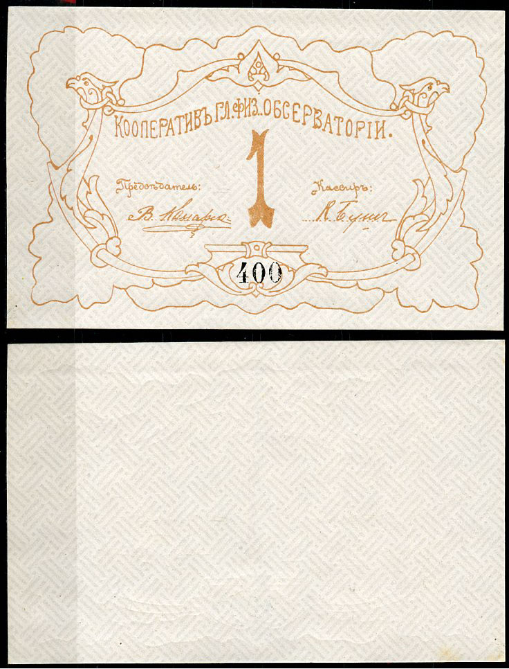 Петроград 1 рубль ND Кооператив главной физической обсерватории, № 400 Рябченко 7177р бумага 439-62-1-1