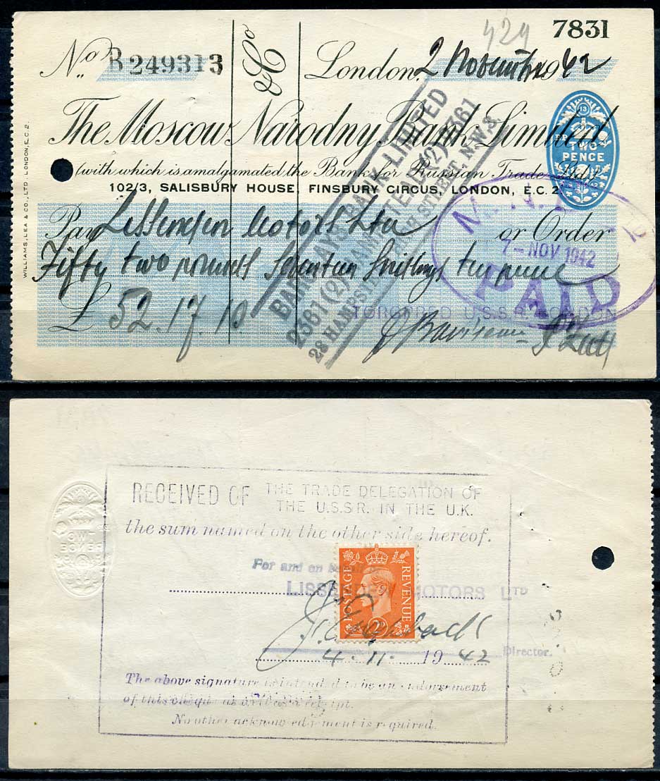 СССР чек в 52 фунта 17 шиллингов 10 пенсов 1942 Московский Народный банк, оплаченный бумага 445-37-1-1