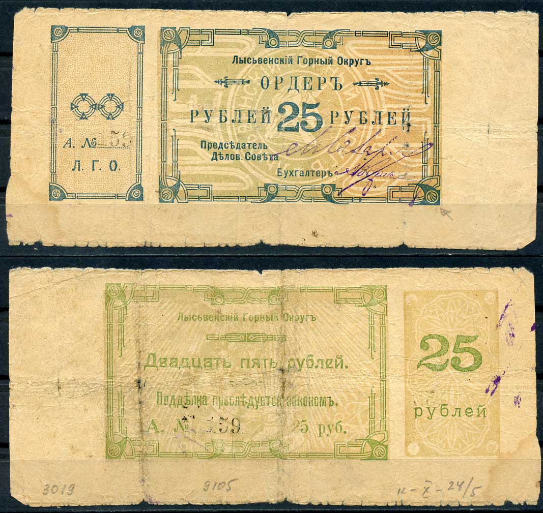 Лысьвенский горный округ. Ордер 25 рублей 1918 Лысьвенский Горный округ. Ордер, серия А. Кардаков 10.2.4.5 бумага 436-50-3-2