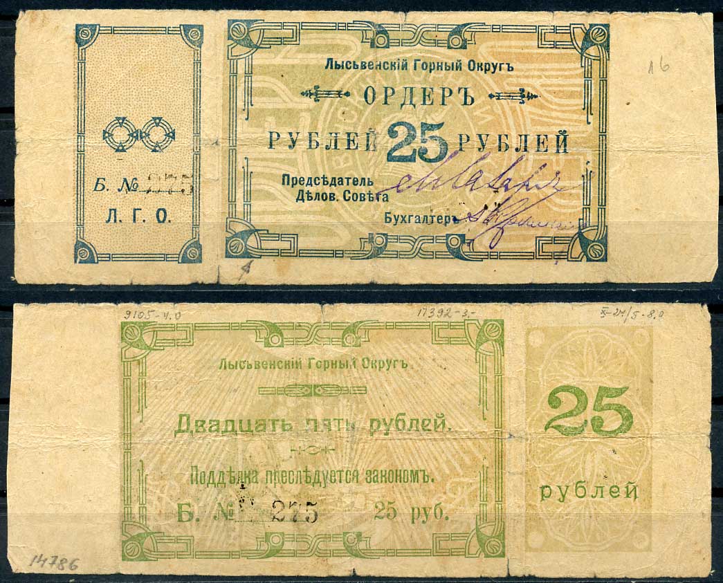 Лысьвенский горный округ. Ордер 25 рублей 1918 Лысьвенский Горный округ. Ордер, серия В. Кардаков 10.2.4.5 бумага 436-51-2-1