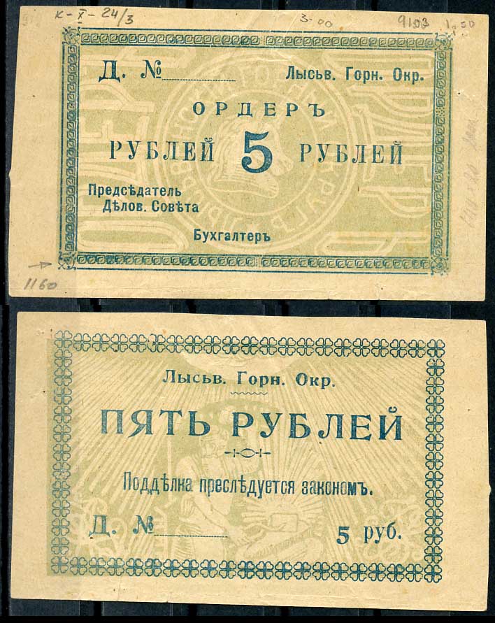 Лысьвенский горный округ. Ордер 5 рублей 1918 Лысьвенский Горный округ. Ордер, бланк. Серия Д. Кардаков 10.2.4.3 бумага 436-50-2-1